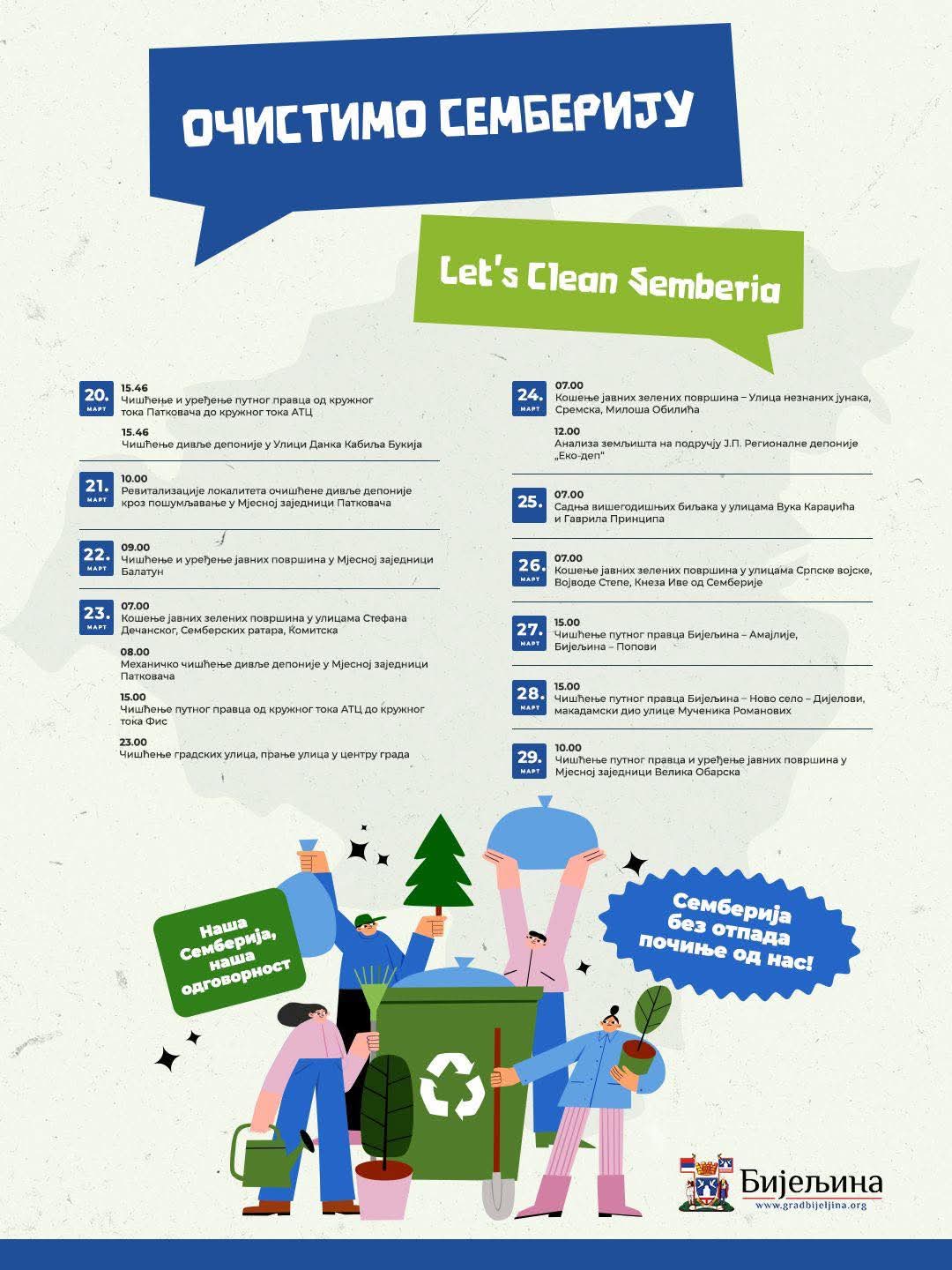 - Акција почиње 20. марта, а трајаће до 5. јуна. Тога дана ће бити проведена акција чишћења од кружног тока код Агротржног центра до кружног тока у Патковачи, те чишћење дивље депоније у Улици Данка Кабиља Букија. Наредног дана, 21. марта слиједи пошумљавање површине некадашње дивље депоније у Патковачи, док ће 22. марта бити актуелно чишћење критичних локација у Балатуну. Кошење јавних зелених површина у улицама Семберских ратара и Стефана Дечанског, те механичко чишћење депоније у Патковачи заказано је за 23. март, као и чишћење путног правца Агротржни центар - кружни ток у Гојсовцу. Иста активност - кошење јавних зелених површина очекује и улице Незнаних јунака, Сремску и Милоша Обилића и то дан касније, 24. марта. Истог дана биће проведена и анализа земљишта око „Еко депа“. Улице Вука Караџића и Гаврила Принципа биће богатије за нове вишегодишње биљке. Садња је планирана 25. марта, док ће наредног дана јавне зелене површине бити кошене у градским улицама Кнеза Иве од Семберије и Војводе Степе. Чишћење путних праваца од Бијељине према Поповима и Амајлијама планирано је за 27. март, а наредног дана у Новом насељу Дијелови и на макадамском дијелу Улице мученика Романових. Садња вишегодишњих засада, након уређења јавних зелених површина, очекује Мјесну заједницу Велика Обарска 29. марта - појаснио је Лазаревић.