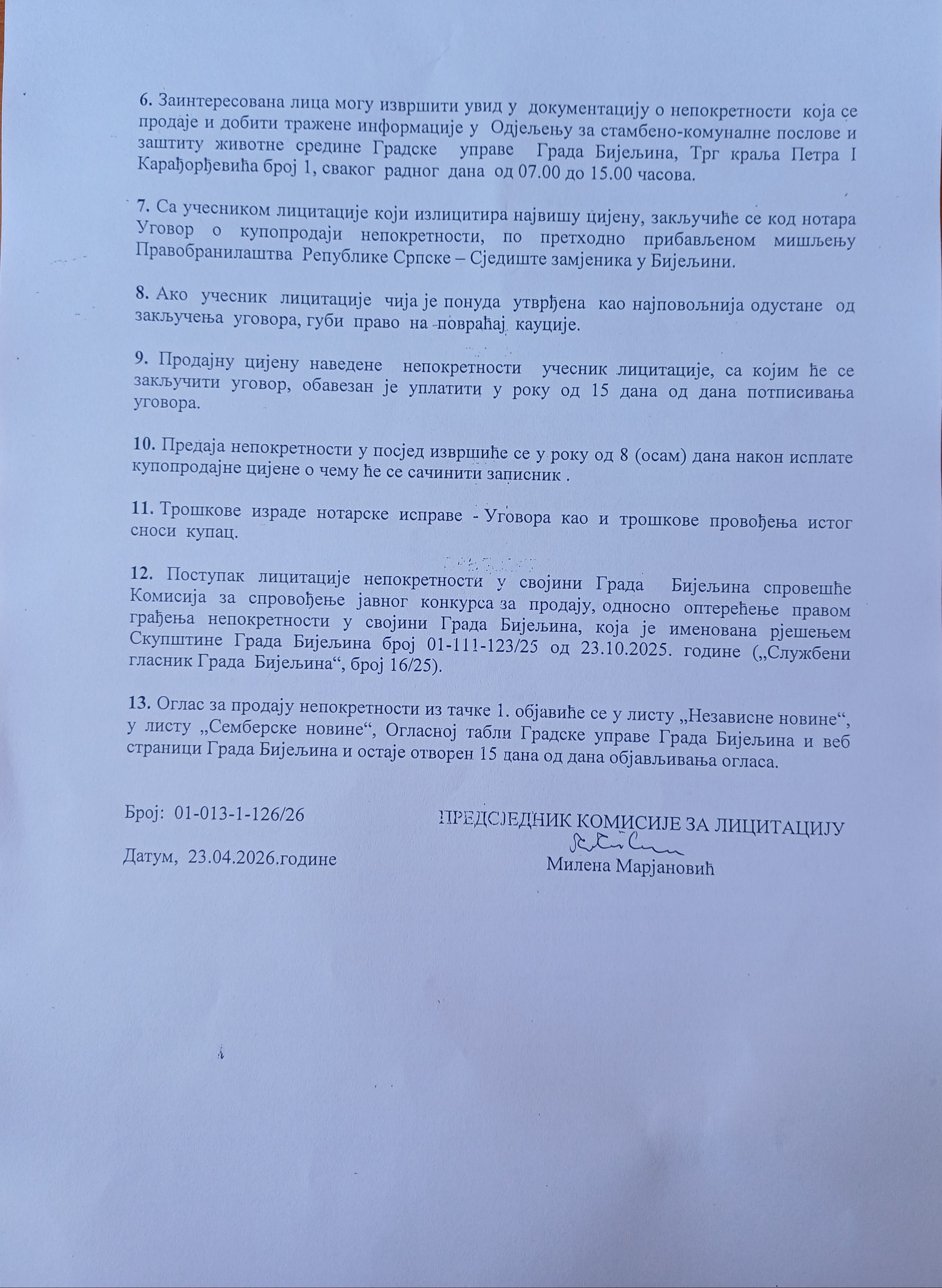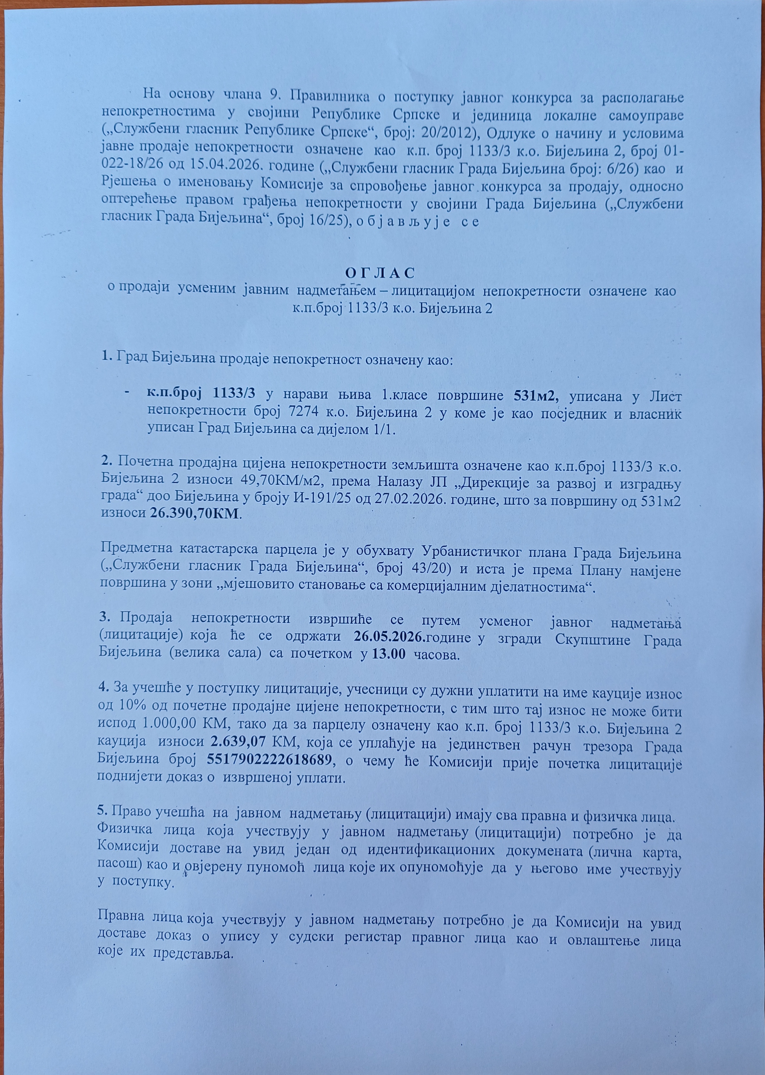 Оглас о продаји јавним надметањем - лицитацијом непокретности означене као к.п. број 1133/3, к. о. Бијељина 2 30. април 2026. године