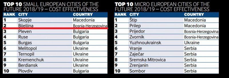 „Фајненшел тајмс“ је оцјењивао услове за пословање у шест категорија по градовима и регијама широм Европе, а поред Бијељине, на листама најпожељнијих градова за инвестирање у региону, између осталих, нашли су се и Зворник, Приједор, Зрењанин, Врање, Зајечар, Сремска Митровица, Сомбор, Штип, Прилеп, Скопље, као и Западнохерцеговачки кантон у ФБиХ.