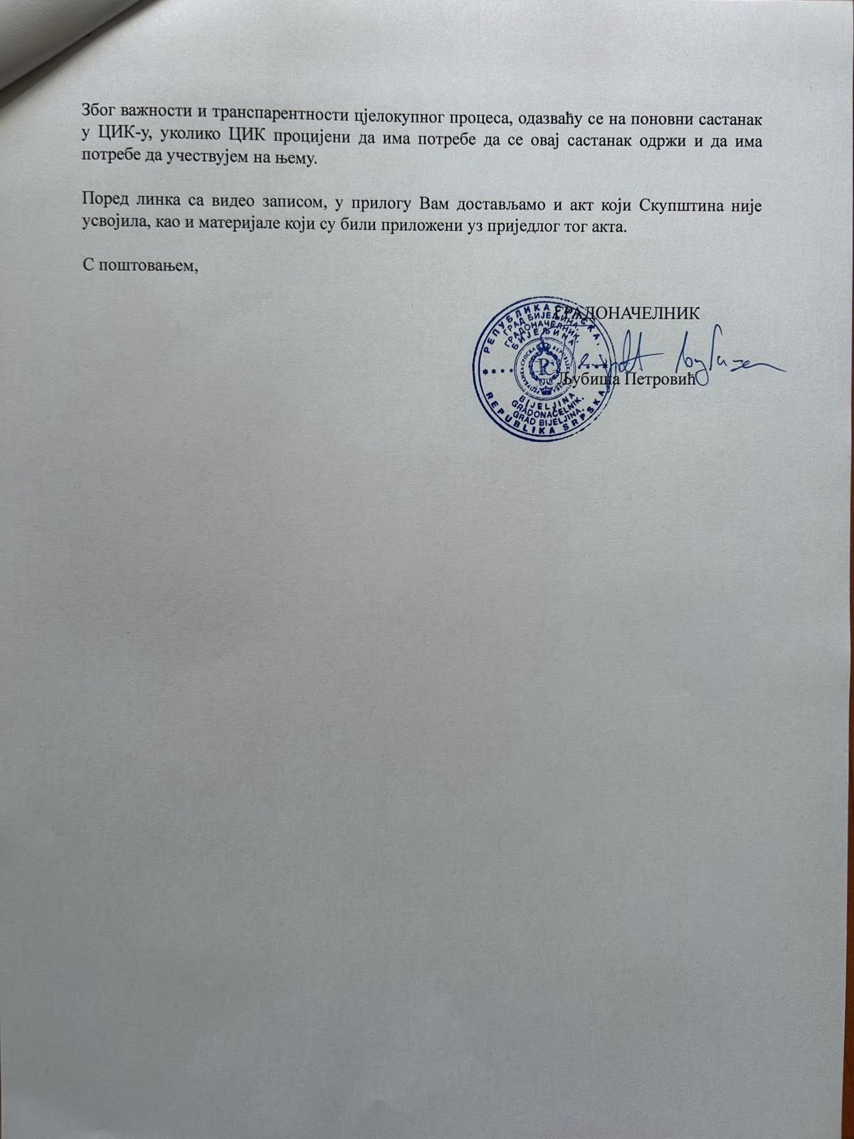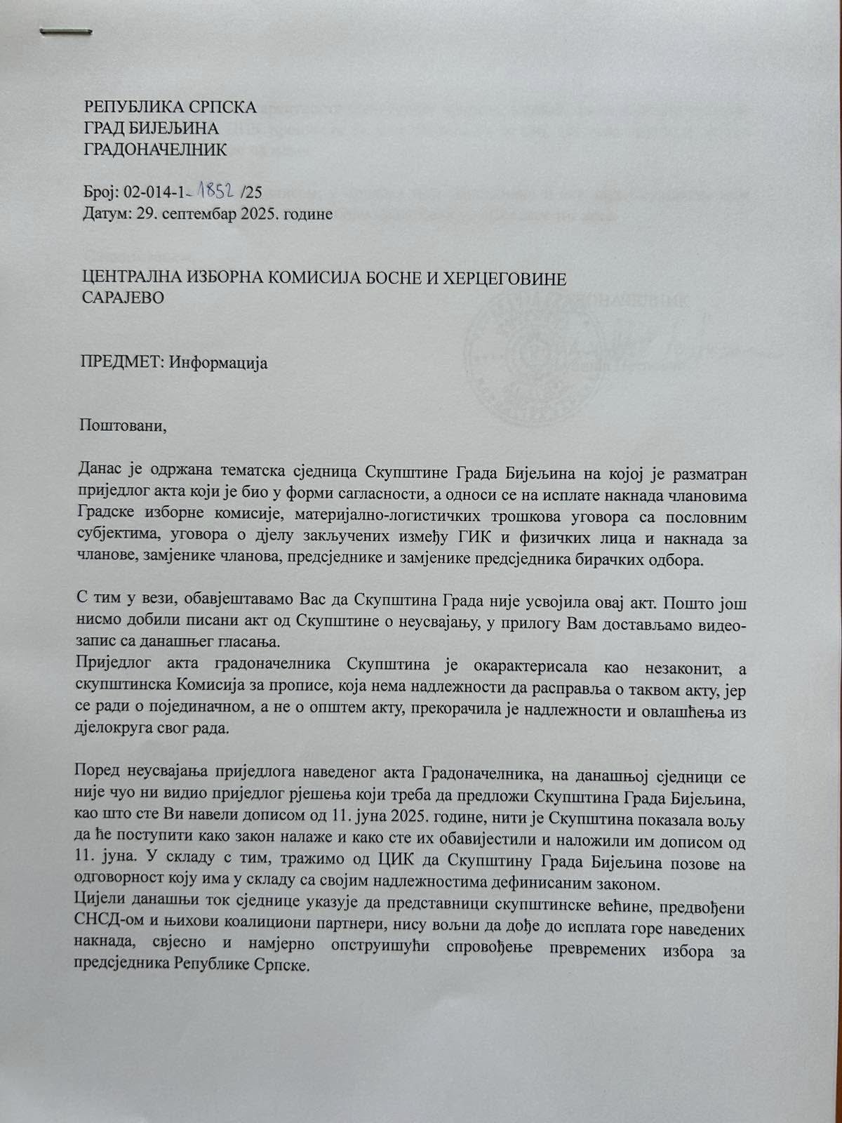 - Неусвајањем акта који представља приједлог рјешења за исплате зарада члановима Градске изборне комисије и бирачких одбора, као и материјалних трошкова избора одржаних 2024. године, Бијељина је остала без могућности за одржавање пријевремених избора. Дакле, неће бити могуће исплатити дуговања учесницима у претходном изборном процесу - члановима Градске изборне комисије, људима који су били ангажовани на основу уговора о дјелу, предузећима и пословним субјектима који су пружали материјално-логистичку подршку током локалних избора, предсједницима бирачких одбора, замјеницима предсједника бирачких одбора, члановима бирачких одбора и замјеницима чланова бирачких одбора, што је близу 3000 особа - објаснио је Градоначелник.